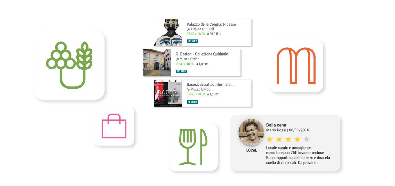L’app è strutturata in due parti: la Home statica, per informazioni di interesse pubblico su enti governativi e attività commerciali, e la Home dinamica con sotto-sezioni come il calendario eventi, promozioni, notizie, coupon, carte fedeltà e percorsi.