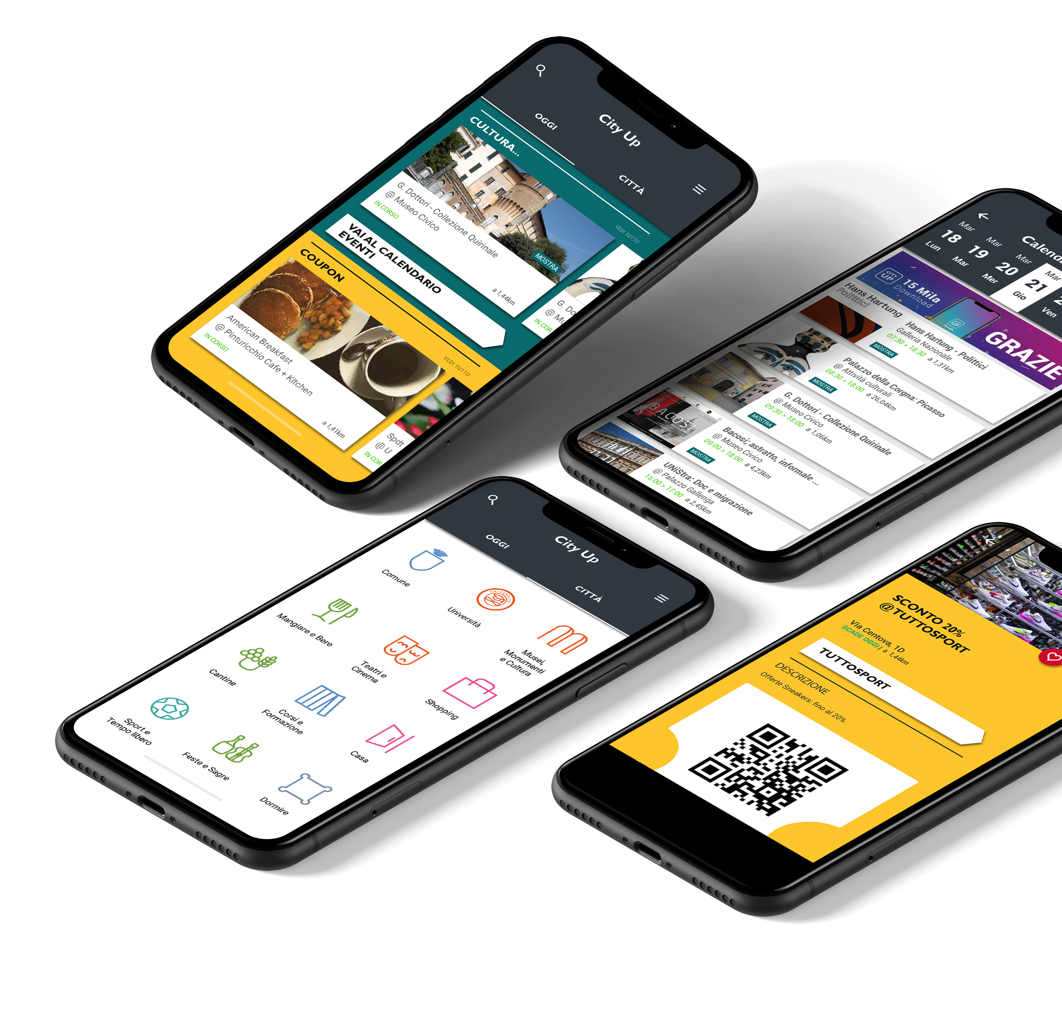 City Up è un’applicazione mobile che connette l’utente alla realtà cittadina, fornendo, grazie ad un costante aggiornamento, informazioni sulla città e sugli eventi che hanno luogo sul suo territorio e puntando alla fidelizzazione degli utenti attraverso programmi fedeltà, sconti e promozioni.