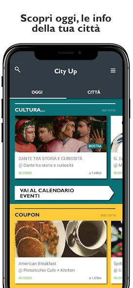 City Up è un’applicazione per smartphone che mette a disposizione dell’utente tutte le informazioni su ciò che accade nella propria città, dalla vita pubblico, istituzionale, culturale fino all’intrattenimento, dallo shopping alla ristorazione, dove dormire, cinema e teatri, servizi, è una vera e propria guida virtuale a portata di mano. In più, giorno per giorno, l’utente potrà trovare tutti gli eventi che animano la città e le promozioni che potrà sfruttare, tramite City Up, con l’utilizzo di appositi coupon.